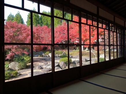 広大な敷地の中に大きな本堂、方丈を有し、紅葉の時期が有名だろうか、境内にはモミジの木々が配され、参道石畳を歩く。受付を済ませ、まずは本堂へと赴くと、その高さといい、声が響くほどの空間、祭壇前には大きな「達磨図」がで~んと掲げられている。そして、天井を見上げれば「雲龍図」もで~んと描かれていて、迫力満点。