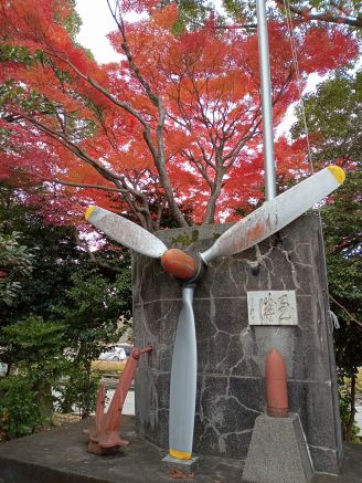山口護国神社は日清戦争以降、山口県出身の英霊が眠り、現社地の南、国道9号線を挟んだ南に桜畠練兵場(現在の陸上自衛隊訓練場)において、盛大な招魂祭を斎行したことに始まる。昭和16年(1941)に社殿を創建、5万柱におよぶ御霊を祀っている。なので、歴史に名を残した大村益次郎や久坂玄瑞、高杉晋作、吉田松陰なども祀られていて、鳥居右手には招魂碑や飛行機のプロペラ、兵士の銅像が安置され、モミジが真っ赤に“彼ら”を照らしている。