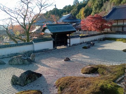 華光寺の道を挟んだ真向かいに光清寺はある。山門を潜り境内に失礼すると、竹垣の囲いの中に石庭が芸術作品のようにある。立て看板には、重森三玲作の「心月庭」とあり、晩年の作とのこと。元は、大きな黒松が植えられていたらしいが枯死し、その後に白砂を設け、石組を配したということで、ここで重森三玲に会えるとは「なるほど~」と唸る。