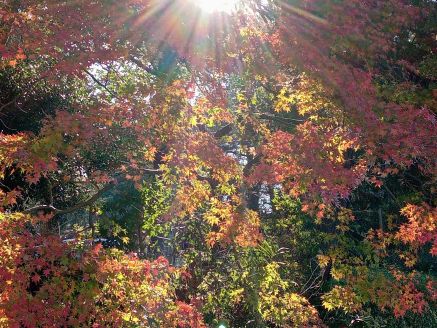 両翼回廊式の拝殿でお参りをし、社殿右手には普通の池なのか、防火水槽用のため池なのかわからないが、その周りを囲むようにモミジが朝陽を浴びて赤く輝いている。こんな美しい光景を見られるのも、日本のために散った英霊たちのおかげだと、やはり護国神社ではしんみりとしてしまう。