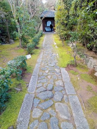 方丈から茶室へと向かう廊下の途中には、“降り蹲踞(つくばい)”(水で手を清める茶室前に設置された手水鉢のこと)があり、深さが2mあるのは珍しいと写真に収め、「雲了庵」の茶室を拝観。庭には北白川の白砂を用いて、富士山のように山を造り、苔で模した川、木々などを配し、風情を醸した、落ち着いた雰囲気。ここに、モミジの“赤”が加われば、さぞ、綺麗なことであろうと、秋の時期に再び訪れることを“織部さん”に願うのでありました~