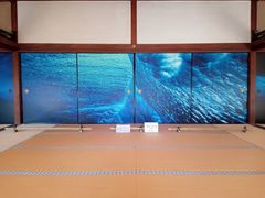 本堂から方丈へと移動し、ガイドさんの案内によって説明を受ける。一際目を引く“青い襖”。写真家、杏橋幹彦氏による海の中から撮影された“うねる波間”の写真で、ちょうど真ん中で波が盛り上がる様相が、手を合わせている“合掌”を表していると。現代の技術で襖に写真を拡大させて表装したらしく、鮮やかな“青”が目に飛び込んでくる。