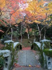 まずは縁側に座って観賞。雪舟庭園は、池泉式回遊庭園となっていて、池の周りには草木が生い茂る中にモミジの木々が見頃を迎えていて、美しい。石組の配置や芝生、苔、緑色の低木が色を添え、庭園を盛り上げている。始めは静かな空間であったが、ガガガ…っと音が響き始め、東屋の方で重機が動きだし、落ち着ける時間はあっという間。仕方がないが、雑音に急かされるように本堂から書院へと移動し、臨済宗中興の祖である白隠禅師の書や「郡山城下図」などの展示を見る。「郡山城下図」は、洞春寺でも説明したが、毛利隆元の菩提寺がこの地に移ってきたので、広島の郡山城跡が描かれているが、この絵図の様子と発掘調査で判明した遺構が一致していることが確認され、絵図の正確性が証明されたと云われている貴重な史料。へぇ~と、じっくりとその絵図を眺めて、次は庭園へ移動。